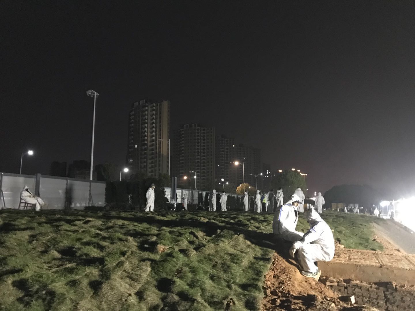 ? ? ? 根據(jù)施工任務(wù)開始組織現(xiàn)場工作,來到火神山第一天,在公司領(lǐng)導(dǎo)的統(tǒng)一指揮下,我們有序完成了火神山醫(yī)院的初步測量及平整場地工作。夜深回到隔離酒店后,發(fā)現(xiàn)爸媽還在等著和我視頻,盡管還是不斷重復(fù)著對我的關(guān)心,但是看著他們臉上的表情已不像昨天那樣充滿著擔(dān)憂,更多的是支持我,讓我注意休息,等我抗疫平安回來。到后面工期更緊,為縮短任務(wù)時間,我們整個團隊一起爭分奪秒地進行一系列工序,晝夜不停地堅守在施工現(xiàn)場;為不影響施工進度,哪怕是暴風(fēng)雨來襲,大家也依舊沒有停歇,鉚足干勁,我們彼此加油打氣:“就是再累再困也要堅持到底”。最終在團隊共同的努力下,我們按時保質(zhì)完成此了火神山園區(qū)24000平方綠化任務(wù)。