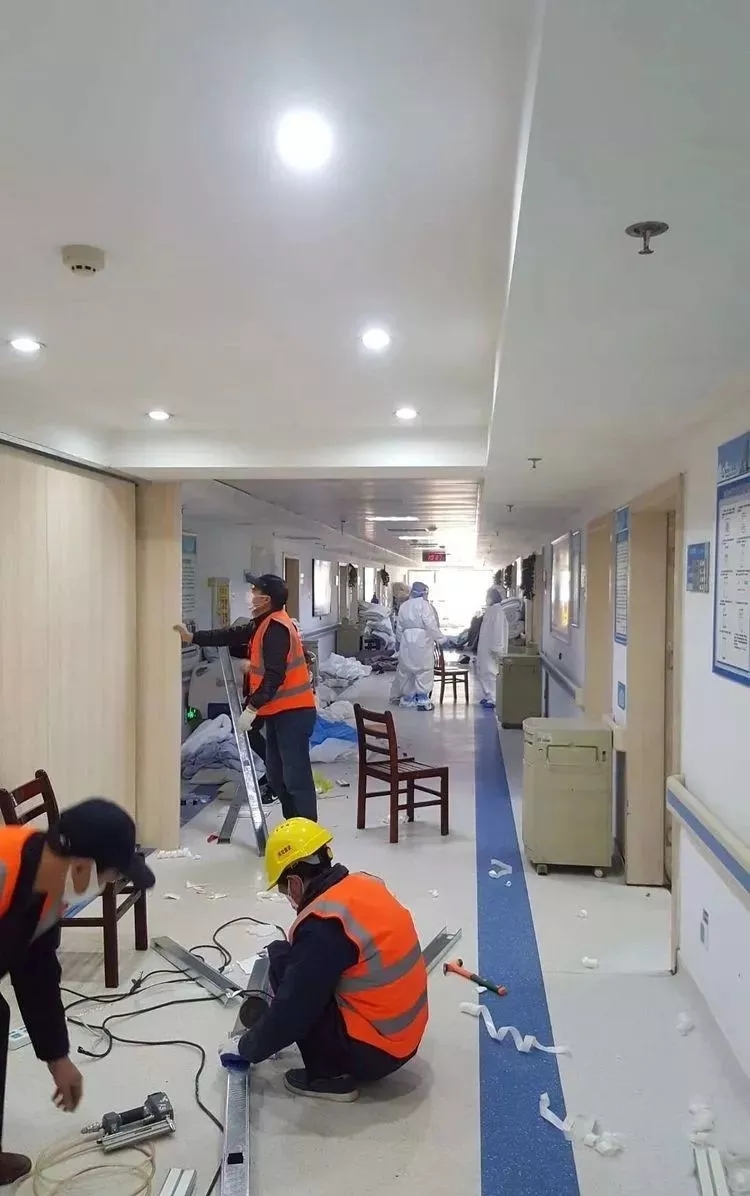 ? ? ? 2月17日下午,在舊樓住院部其余樓層完成消毒之后,項目人員再次緊急前往醫(yī)院,進行第二階段的施工,項目人員連軸轉(zhuǎn)直至第二天清晨。2月18日上午,為了嚴(yán)格貫徹上級“寧可讓床等人,也不要讓人等床”的指示,院方?jīng)Q定再新增一棟樓作為備用,在方案確定之后,公司積極響應(yīng),同步啟動第三階段施工,由于時間緊、任務(wù)重,公司從其他收尾項目抽調(diào)了10余名管理人員,60多名工人進行人員補充,確保了新樓舊樓同步施工。