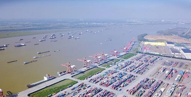 航拍長(zhǎng)江上貨船往來(lái),碼頭上集裝箱擺放有序(來(lái)源:新華網(wǎng))