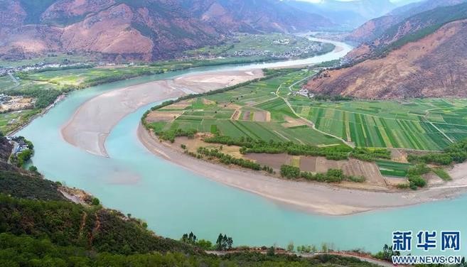 云南省麗江市石鼓鎮(zhèn)綠樹和農(nóng)田掩映下的“長(zhǎng)江第一灣”(來(lái)源:新華網(wǎng))