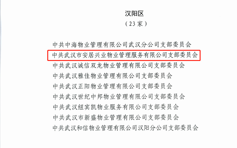 近日,中共武漢市物業(yè)行業(yè)委員會(huì)公布《2021年武漢市物業(yè)行業(yè)基層黨組織示范點(diǎn)名單》,漢陽市政安居興業(yè)公司黨支部名列其中。經(jīng)各區(qū)物業(yè)行業(yè)黨委推薦報(bào)送,武漢市物業(yè)行業(yè)黨委審核評(píng)定,全市共有186個(gè)基層黨組織被命名為“2021年武漢市物業(yè)行業(yè)基層黨組織示范點(diǎn)”。