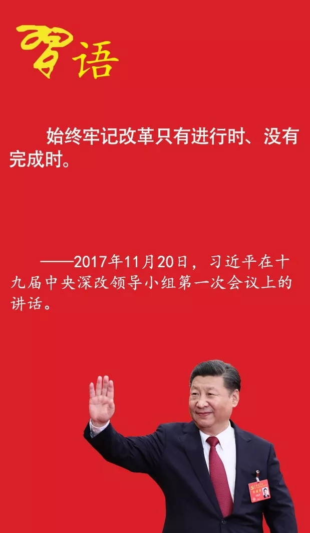 ——這是習(xí)近平總書記在十九屆中央深改領(lǐng)導(dǎo)小組第一次會議上的講話。此前,“改革只有進行時、沒有完成時”的論述已廣為人知,但此次加上“始終牢記”4個字,進一步彰顯出黨的十九大繼續(xù)推進全面深化改革的堅定決心。