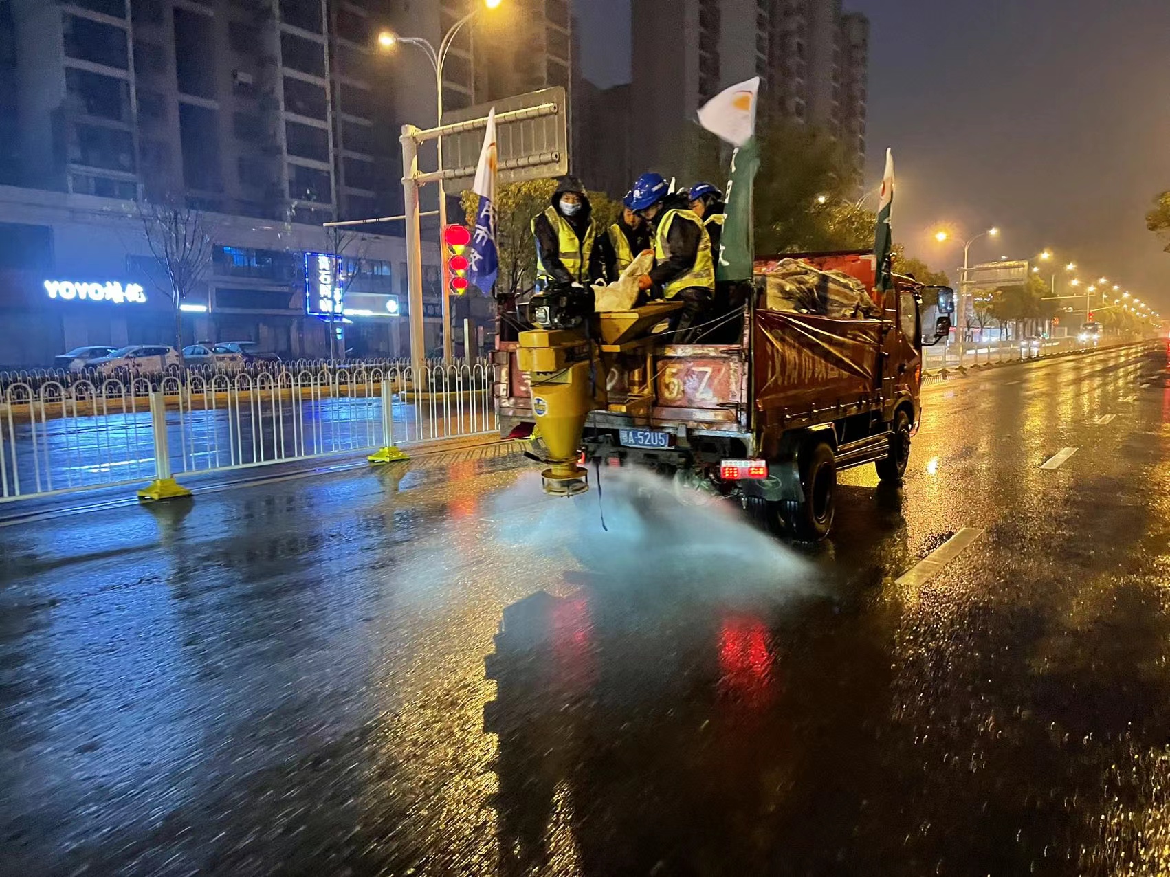 ? ? 瑞雪慶春,銀裝素裹,皚皚白雪雖然美麗,但也給出行帶來了不便。為確保市民出行安全,2月7日凌晨2點(diǎn),漢陽市政志愿者服務(wù)隊(duì)、黨員突擊隊(duì)、清雪除冰應(yīng)急隊(duì)緊急出動,在漢陽區(qū)墨水湖北路、漢陽大道等主干道進(jìn)行撒鹽融雪除冰。截止2月7日上午11時,已經(jīng)出動人員220余人,撒鹽車輛40余臺,融雪用鹽近百噸,確保漢陽區(qū)主干道無結(jié)冰。